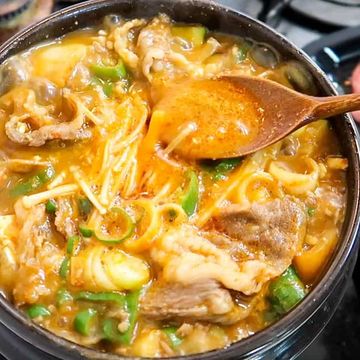 Contains: Wheat, Soybeans. Sukiyaki hot pot offers a perfect balance of sweet and savory flavors, featuring a rich soy-based broth enhanced with hints of sugar and mirin.